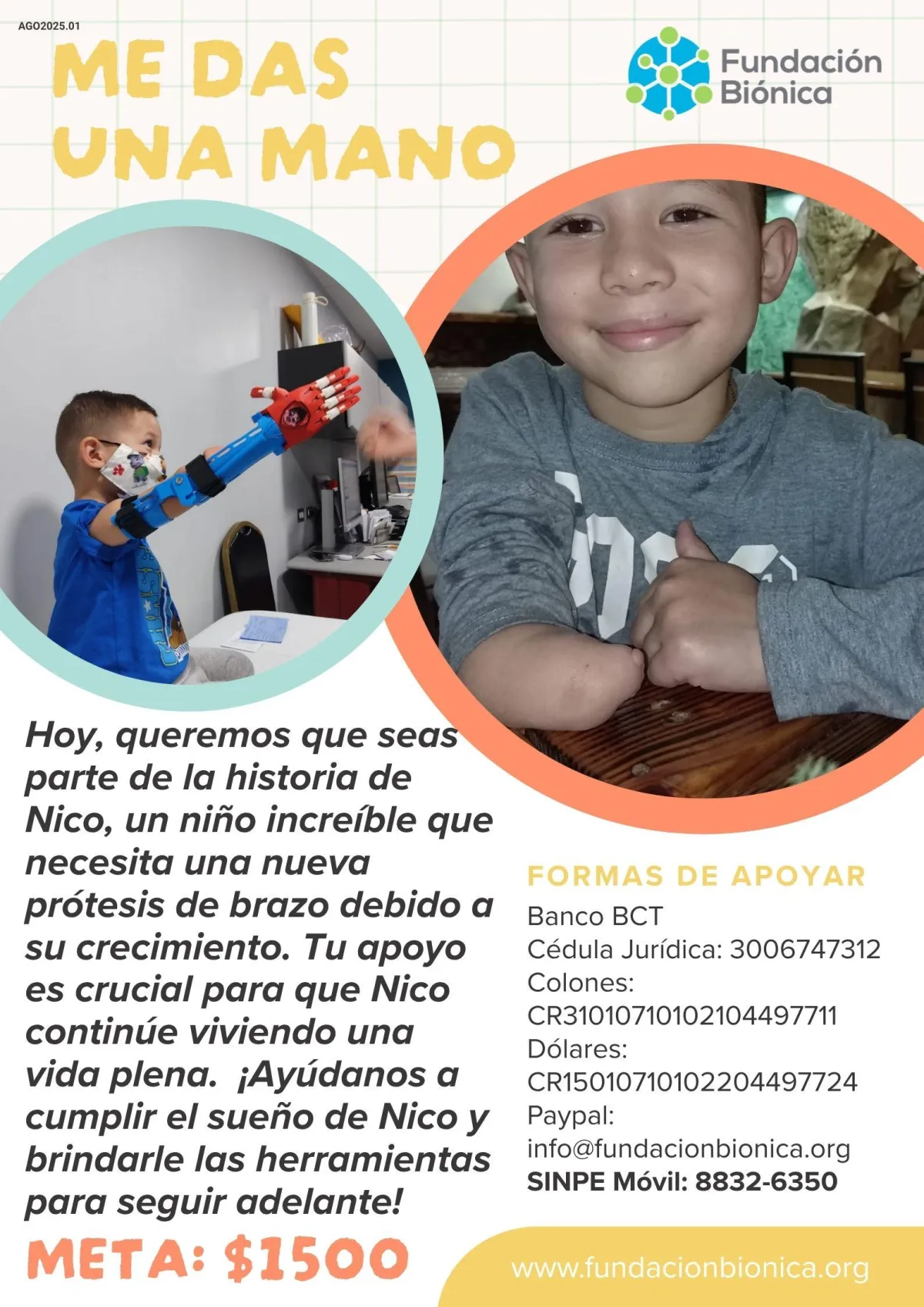 Nicolas Alfaro Vázquez es un niño increible, muy feliz, risueño y alegre, que necesita una nueva prótesis de brazo debido a su crecimiento. El el año 2022 la Fundación Biónica le donó su primera prótesis y hoy requiere una nueva. Tu apoyo es crucial para que NIcolas continúe viviendo una vida plena y que pueda seguir adelante con sus sueños y metas.