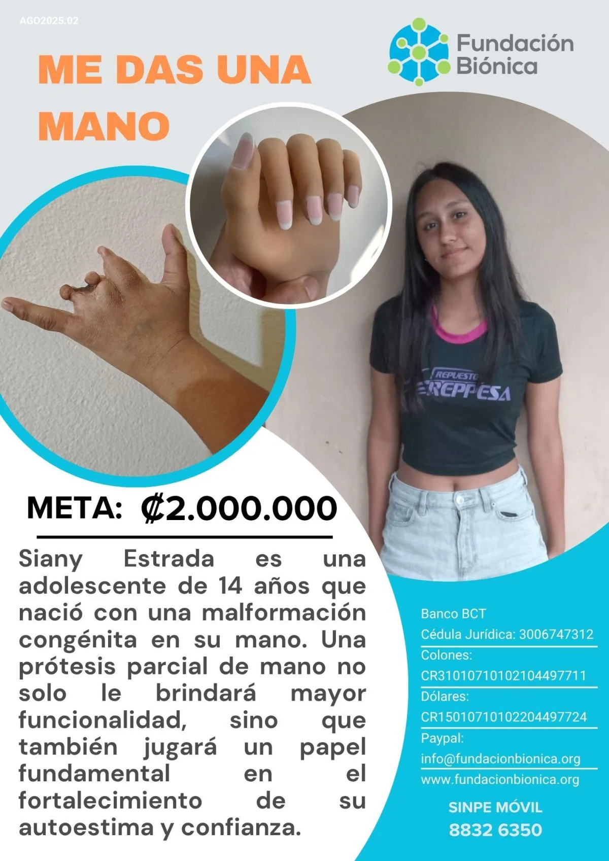 Siany Estrada Chavarría, una adolescente de 13 años que nació con una malformación congénita en su mano. Una prótesis parcial de mano no solo le brindará mayor funcionalidad, sino que también jugará un papel fundamental en el fortalecimiento de su autoestima y confianza. Tu apoyo puede ayudar a Siany a vivir una vida plena y sin limitaciones, permitiéndole participar en todas las actividades que disfruta y desarrollar su potencial.